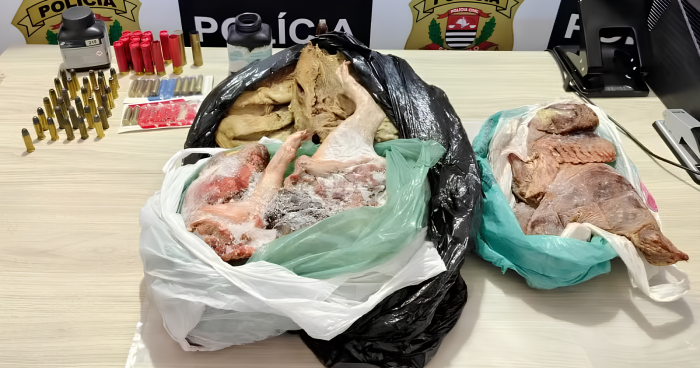 Dentro da residência, os agentes encontraram um freezer com carcaças congeladas de paca, saruê e jacu, somando mais de seis quilos de carne. Também havia pedaços de carne de porco defumada e outros produtos que, segundo a polícia, indicavam o abate irregular de animais.